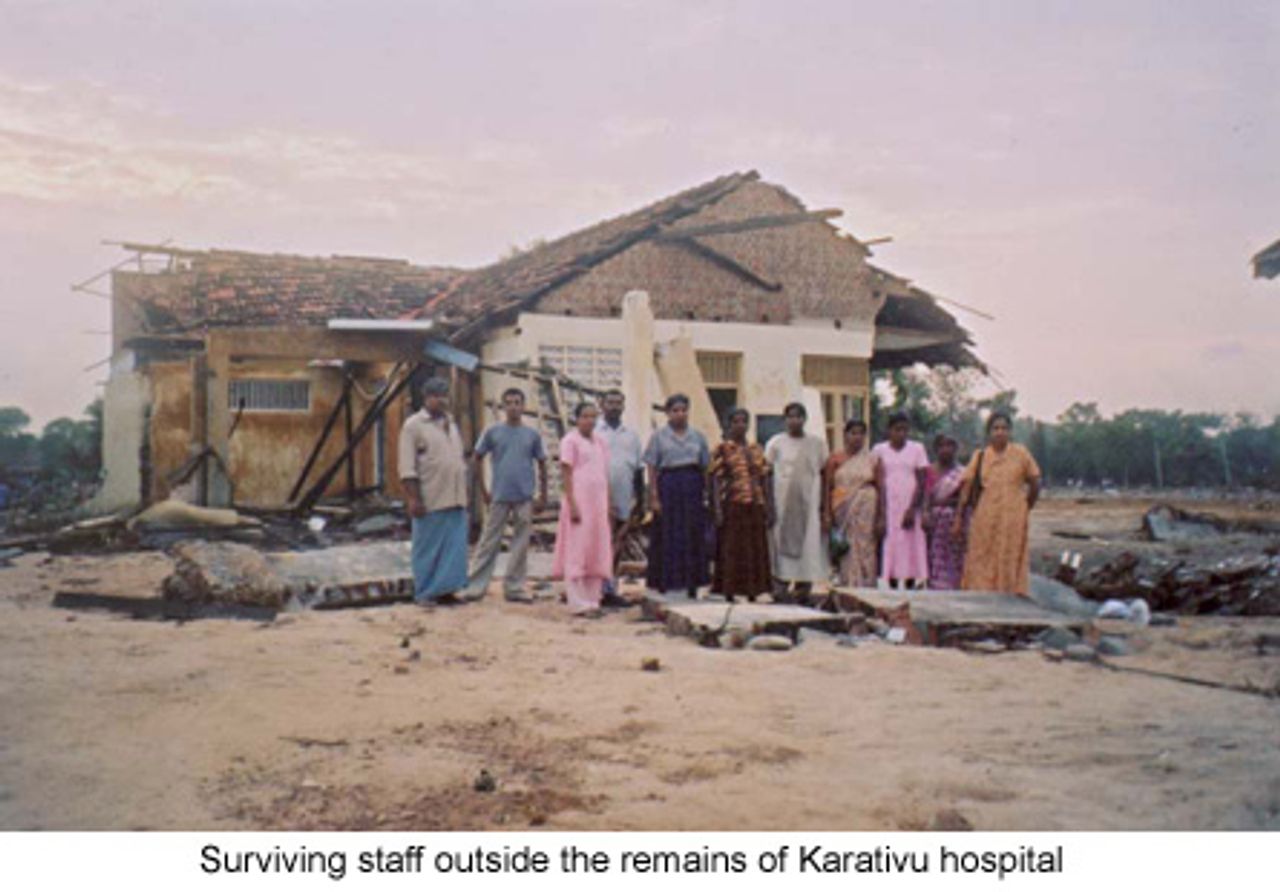 The Karaitivu hospital near the coast was also badly damaged. All 25 patients and one of the nurses were killed. The rest of the medical staff managed to survive. The hospital doctor was engulfed by the waves, but was able to cling to the branch of a tree.