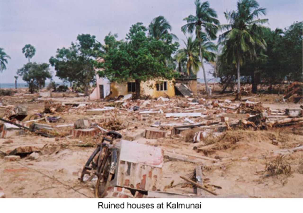 At Karaitivu, previously densely populated, the whole area had been flattened. For first 50 metres, not even a broken wall could be seen, only debris. Half a kilometre inland, water reached the second floor of the Karaitivu Central College buildings. At the front of the school, the water had carved out a huge trench over a metre deep.