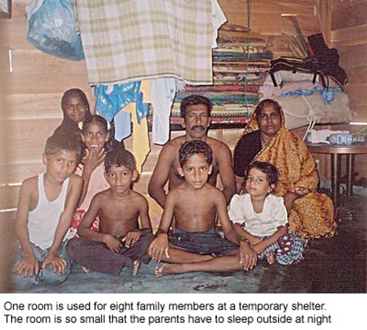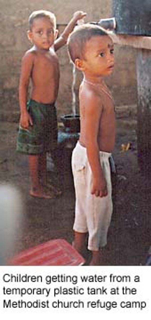 At the YMCA and Methodist church at Akkaraipattu, all the refugees were fishermen and their families from the village of Sinna Muhathuwaram. The main hall of the YMCA has been partitioned into tiny rooms—less than three by three metres—using cellophane cloth. Outside there are a few canvas tents. All of the facilities are primitive—water, for instance, comes from a temporary plastic tank. Yet 37 families live in the camp.