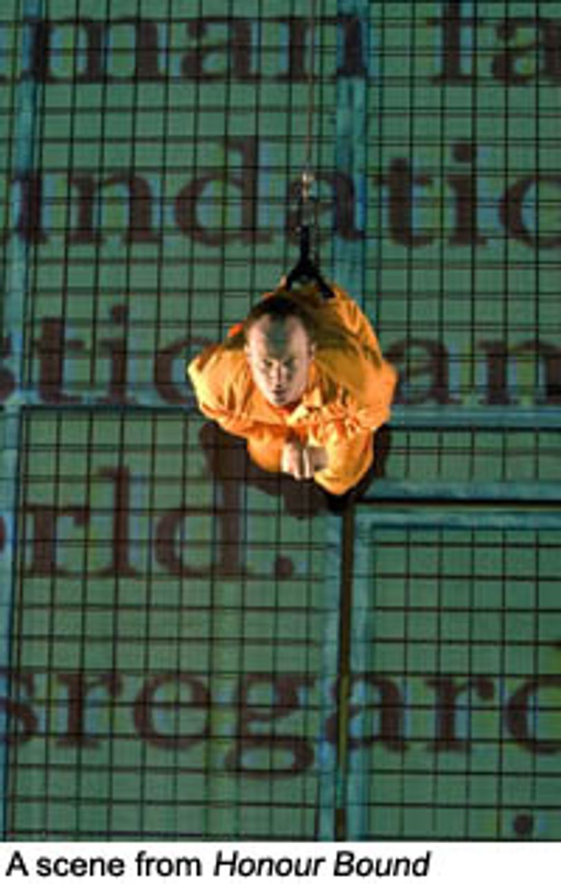 Honour Bound has many striking moments. The most memorable is when one of the dancer/prisoners, who is suspended about two and a half metres above the stage, appears to walk along the projected text of the Geneva Conventions on the treatment of war prisoners. Just before he reaches the end of the animated and moving words, they suddenly flip over and he plummets to the floor, forced to reclimb the wall and begin the process all over again.