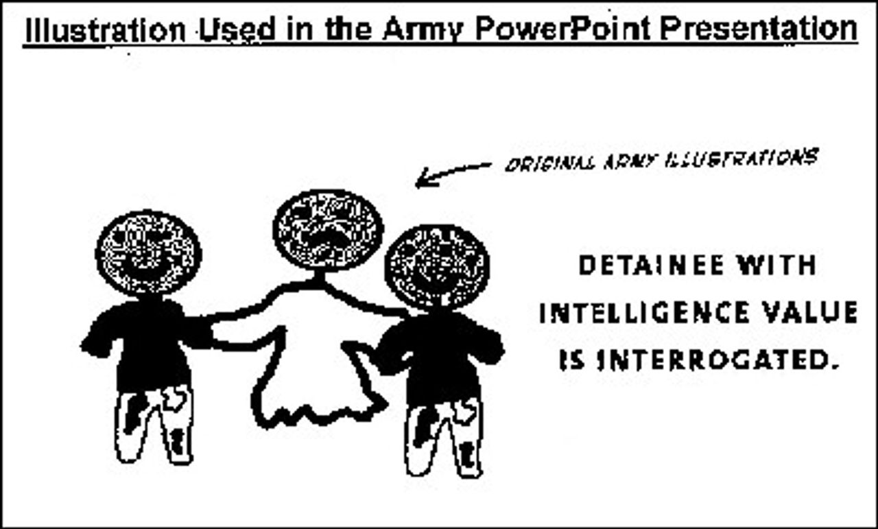 Along these lines, the film shows army documents that include power point presentations using happy/sad-face illustration figures with captions such as, “Detainee Arrives at Abu Ghraib [happy-face for detainee and interrogator]. Screeners assess for intelligence value,” and “Detainee with intelligence value is interrogated [sad-face for detainee, happy-faces for interrogators].”