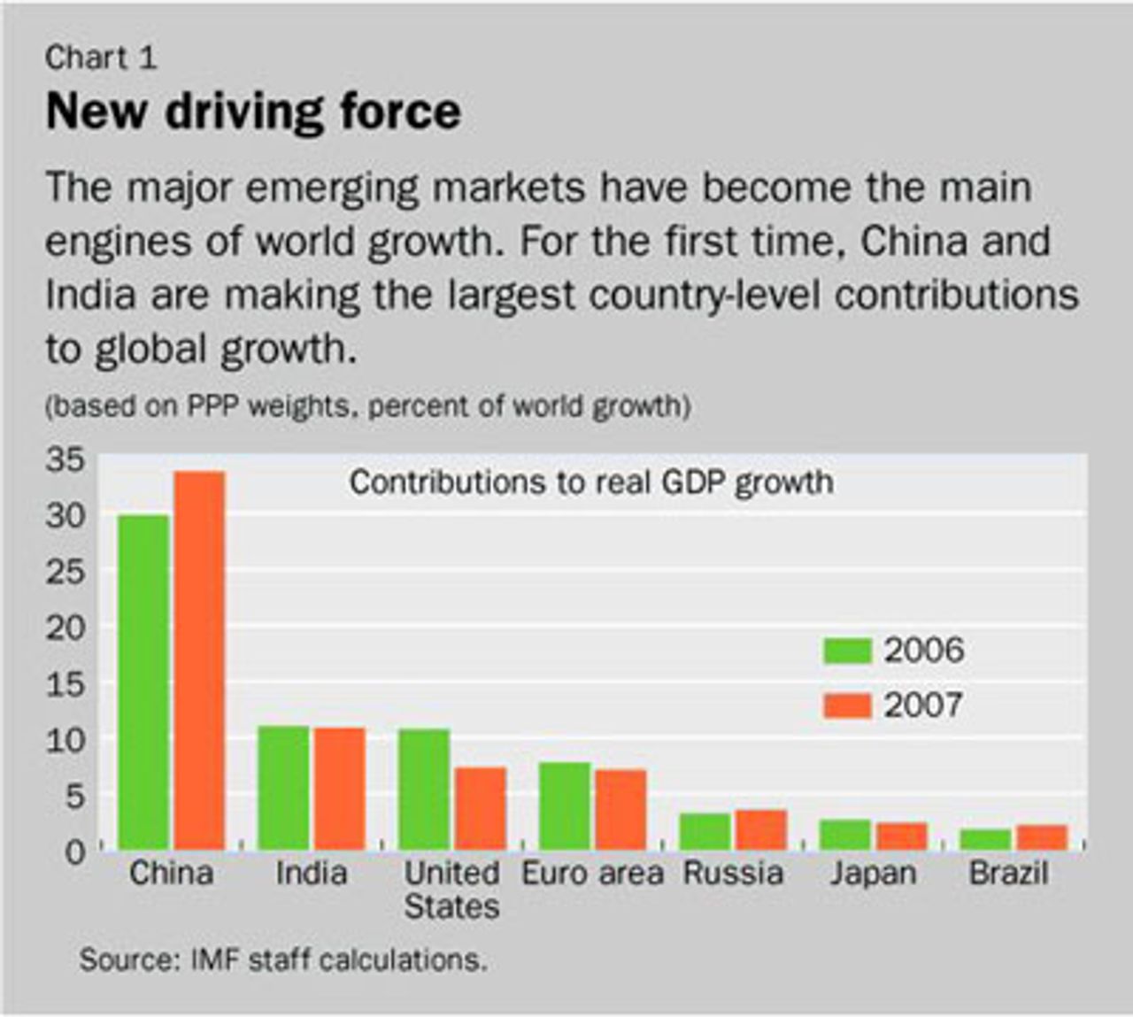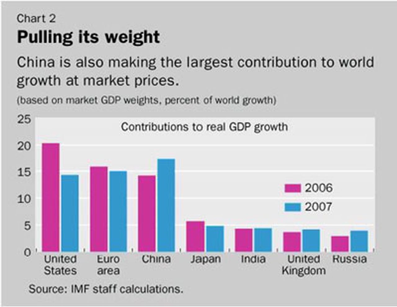 An article published in the IMF Survey magazine of October 2007 makes clear how significant Chinese and Indian economic growth has been. China is now the single most important contributor to world economic growth as the following charts indicate.