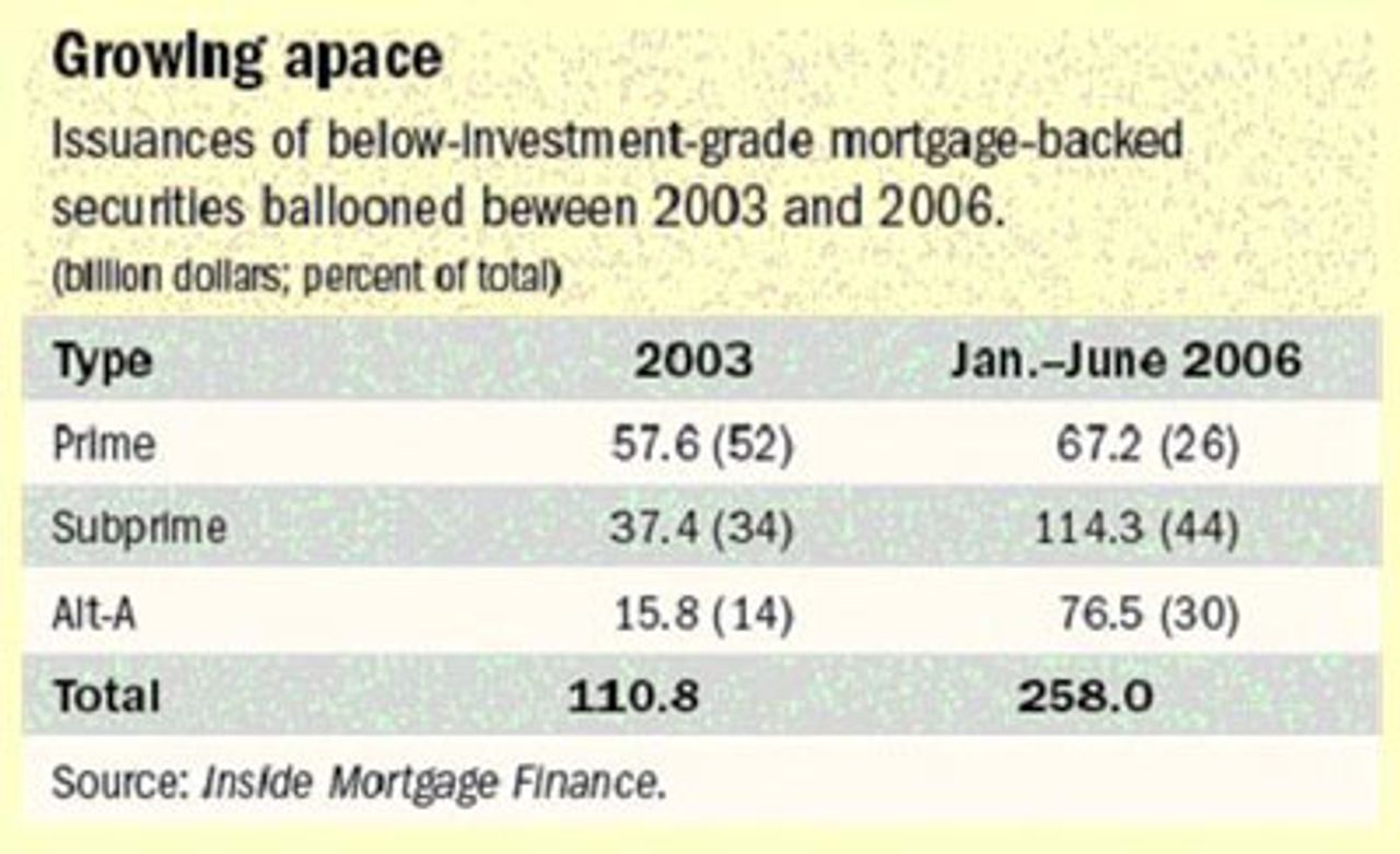 In 2001, subprimes accounted for 8.6 percent ($190 billion) of mortgage originations. By 2005, this had risen to 20 percent ($625 billion). These mortgages were then sold off in the form of financial assets. In 2001, so-called securitised subprimes amounted to just $95 billion; by 2005 this had grown to $507 billion.