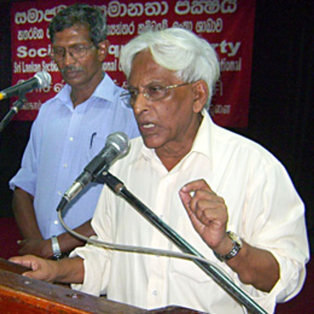 K. Ratnayake with M. Thevarajah (left) translating into TamilThe final speaker, SEP Political Committee member K. Ratnayake, said: “The April 8 elections will mark a turning point in Sri Lankan politics. Rajapakse’s government is preparing to extensively use police-state measures following the elections. He insists that a ‘strong government’ is needed to wage a ‘war on the development front,’ likening it to the war against the LTTE. This is the language of ruthlessly unloading the burden of the economic crisis onto workers.”