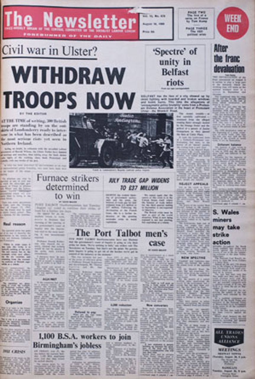 ‘The civil rights movement of Ireland is opposed to this slogan and is anxious that the British solidarity movement does not advance it. It argues that the arrival of British troops prevented a pogrom and for it to demand a recall would be suicidal.