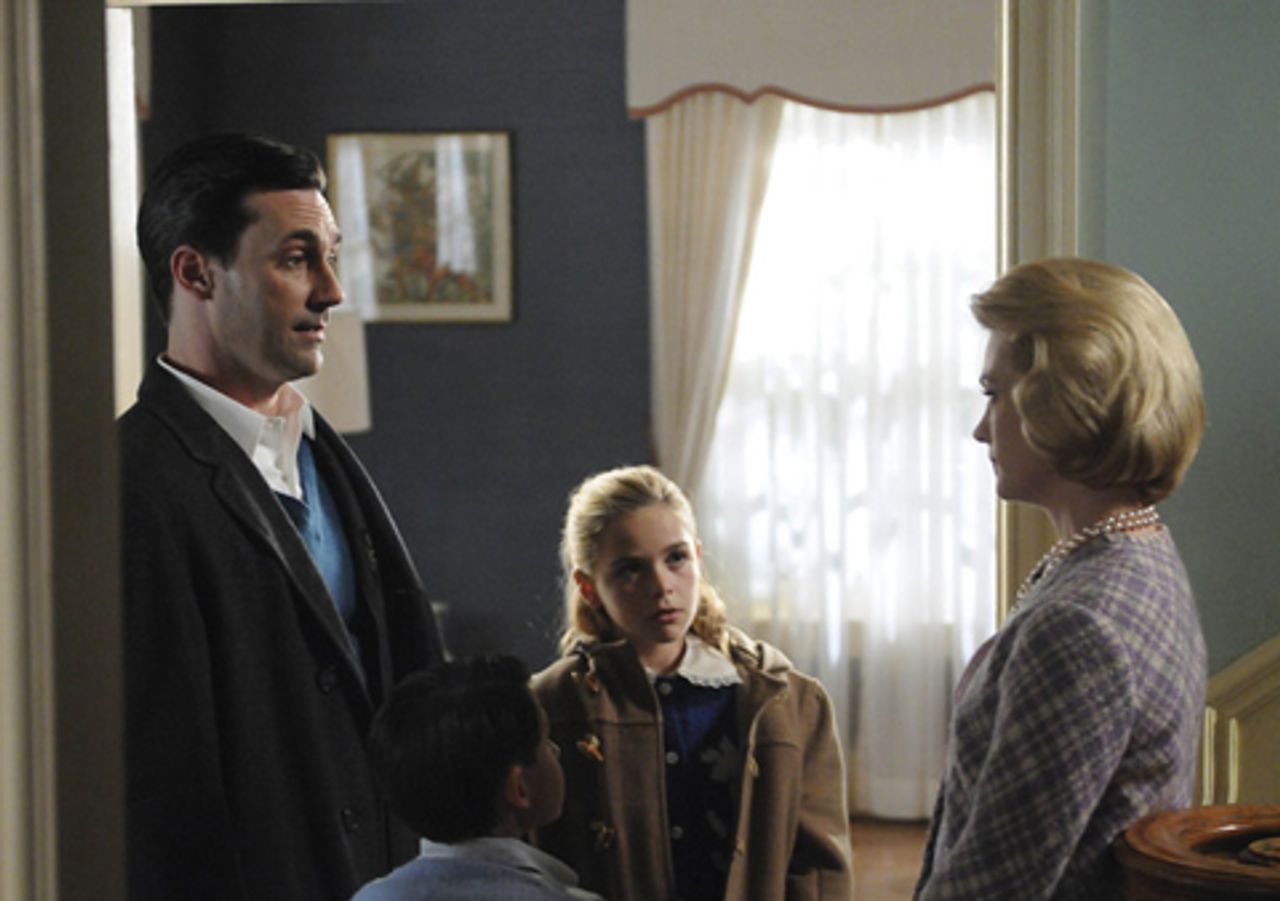 Betty’s 10-year-old daughter, who was experimenting with alcohol even before her parents’ divorce, vomits up the food with which her mother tries to force-feed her, an action that strikes the viewer in both the literal and metaphoric senses. The event does not augur well for the three Draper children (a baby having arrived in the waning days of the marriage).