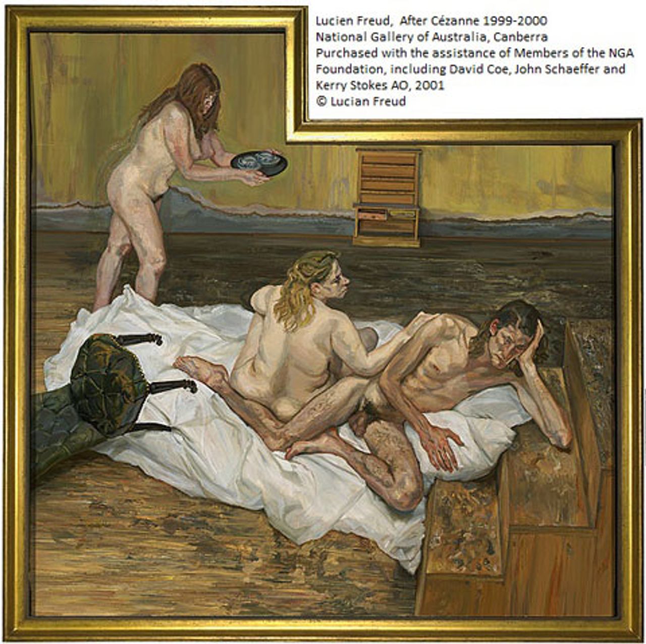 In After Cézanne, (2000), Freud depicts three naked figures in a chaotic interior comprising a bed with crumpled sheets, an upturned chair and empty bookcase. Each figure is painted differently, its flesh fatty and sagging, angular and taut, pale or flushed. There is a definite feeling of tension and alienation, a strong sexual undercurrent and sense of mystery about what precisely is taking place.