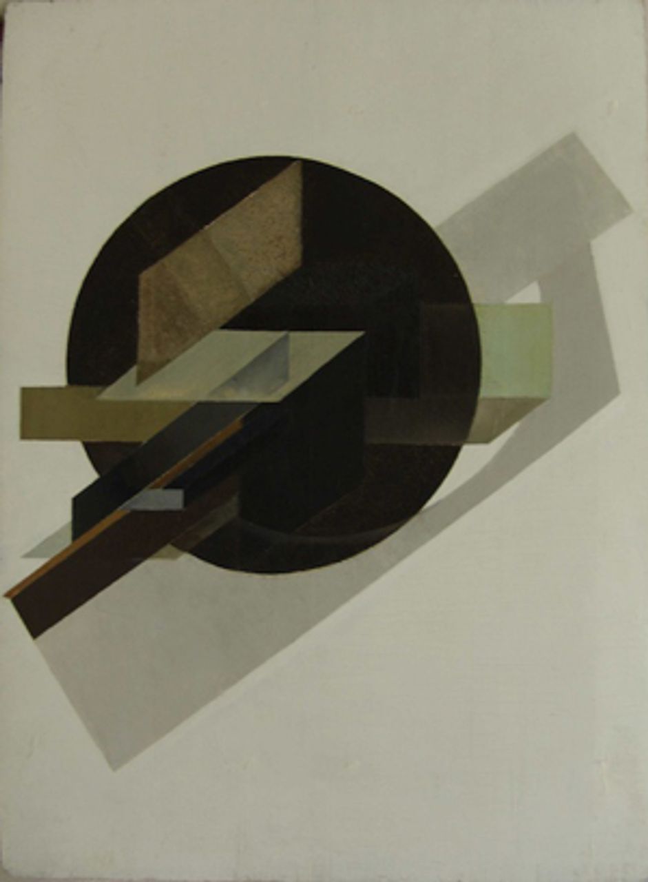 Spatial Force Contruction by Lyubov PopovaDuring 1920 the country was engulfed in civil war, as the Red Army drove the white forces of landlords and capitalists, backed by imperialist munitions and invading troops, off the land. Everything was scarce. The painter used a wooden panel, which had previously supported a religious icon and was probably salvaged from a church, and sanded the surface, leaving luminous birch wood and rusty nail holes exposed. Red, semi-circular strokes slice through the image in an expanding spiral, as if a scythe were clearing the historical landscape of a diminishing white residue.