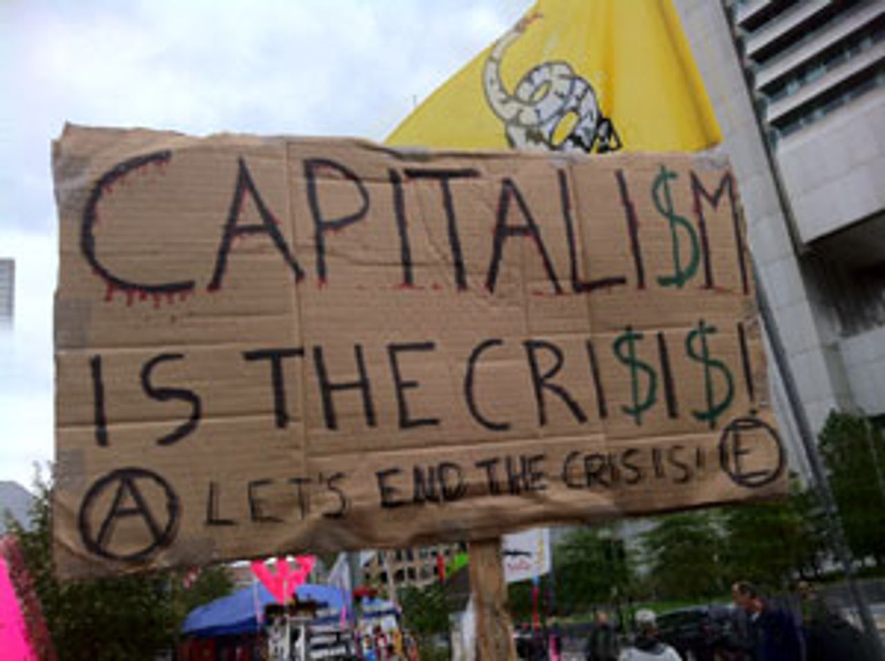 A sign at the Boston protestWith Occupy Boston nearly a month old, protesters are maintaining their encampment of about 150 tents in the city’s financial district. The protest was the target of a raid on October 12, when Boston police in riot gear cleared protesters out of an area adjacent to the original location where protesters had set up camp. A number of the 147 people arrested in the early morning raid still face charges.