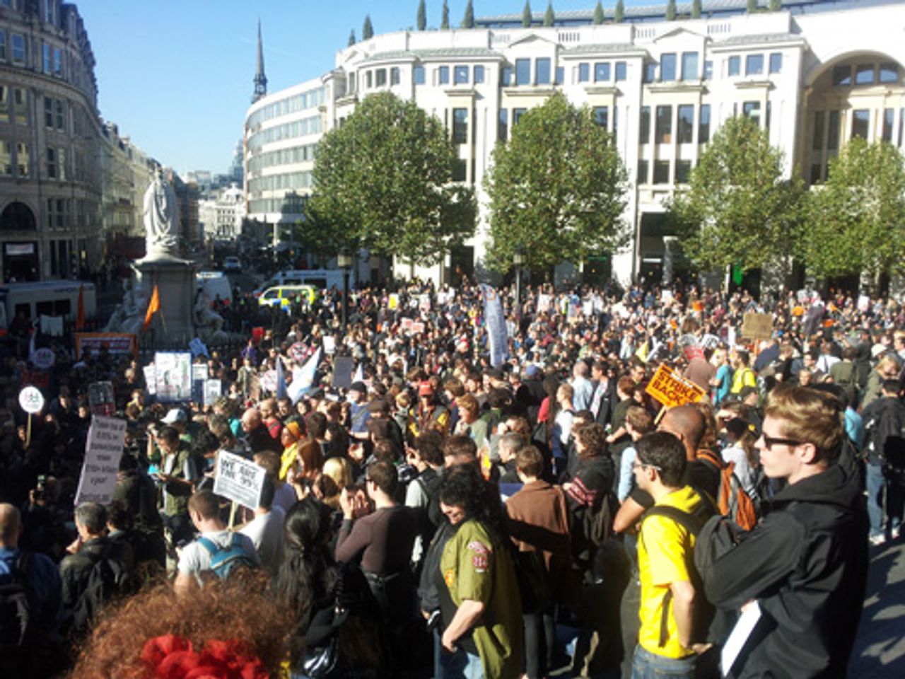 ලන්ඩන්වල සෙන්ට් පෝල් ආසන දෙව්මැඳුරේ පිටත 4,000ක් පමන විරෝධතාකරුවන් එක්රැස් ව සිටි අතර ඔවුන් පැටනෝස්ටර් චතුරස‍්‍රය අසල ලන්ඩන් කොටස් හුවමාරු මධ්‍යස්ථානය කිට්ටුවට වත් යෑම පොලිස් ක‍්‍රියාන්විතයන් විසින් වලකනු ලැබ තිබින. තව ද එඩින්බර්ග්හී සුලු උද්ඝෝෂනයක් පැවැත්වින.