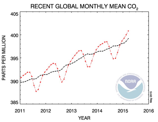 2011ත් 2015ත් අතර කාලය තුල මාසික වායුගෝලීය කාබන් ඩයොක්සයිඩ් සාන්ද්‍රනය.(පැසසුම. NOAA) Credit: NOAA