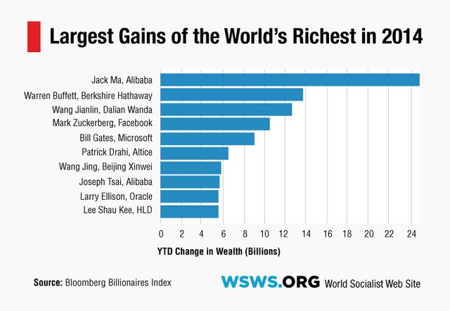2014දී වැඩිම ප්‍රතිලාභ අත්කරගත් ප්‍රකෝටිපතියන් තිදෙනාගෙන් දෙදෙනෙක්ම වාසය කරන්නේ, පසුගිය වසරේ චීන ෆුට්සි සින්හුවා 200 දර්ශකය සියයට 49.49න් ඉහල යාමත් සමඟ කොටස් වෙලඳපොල බුබුලක් අත්දකිමින් සිටි චීනය තුලය. අලිබාබා ව්‍යාපාර සමූහයේ සභාපති ජැක් මා, සැප්තැම්බර් මස පටන්ගත් තමන්ගේ ප්‍රධානත්වයෙන් යුත් චීන අන්තර්ජාල ව්‍යාපාර සමාගමේ ආරම්භක කොටස් නිකුතුවෙන් පසුව සිය ධනය ඩොලර් බිලියන 28.7ක් දක්වා බිලියන 25.1න් ඉහල පිනූ ආකාරය දැක ගත්තේය.