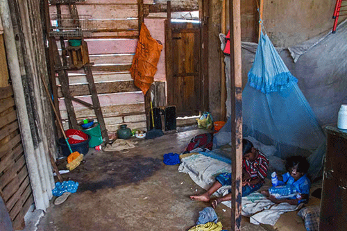 “ලමයි තුන් දෙනාටම දරුනු ලෙස හතිය තියෙනව. රිජ්වේ රෝහලෙන් අපිට දුන්නු රිපෝට් පෙන්නලා මන්තී‍්‍රවරුන් ගනනාවක් ලඟට ගිහින් තමයි මෙහෙ පැල්පතට ආවේ. ඊට කලින් අපි පේමන්ට් එකෙත් හිටිය, පැල්පත් කීපයකම කුලියටත් හිටිය. මහත්තය කුලී වැඩ කරන්නේ, දිනකට ලැබෙන්නේ රු. 500-700 වගේ ගානක්, ඒකෙන් පැල්පතක කුලිය හෝ අත්තිකාරම ගෙවන්න හරිම අමාරුයි. මෙහෙම ලබා ගත්තු ගේ තමයි තමයි පෙබරවාරි 16 කුඩු කරලා දැම්මේ.