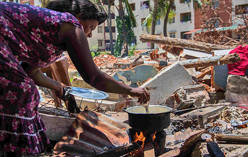 “ගේ කඩනකොට එතනට ගිය පොඩි දුවට, එතත හිටපු මහත්තයෙක්ගේ සපත්තු පාරක් වැදුන. ඔලුව ඉදිමිලා ඉස්පිරිතාලේ ගෙනිහින්, එතන තුබුනු ලේ ගෙඩිය පලල මැහුම් දාන්නත් උනා. තාම එයාට හරියට සනීපයක් නැහැ. අපිට යන්න තැනක් නැහැ, අපි මැරෙන්න හරි මෙතනම ඉන්නවා.”
