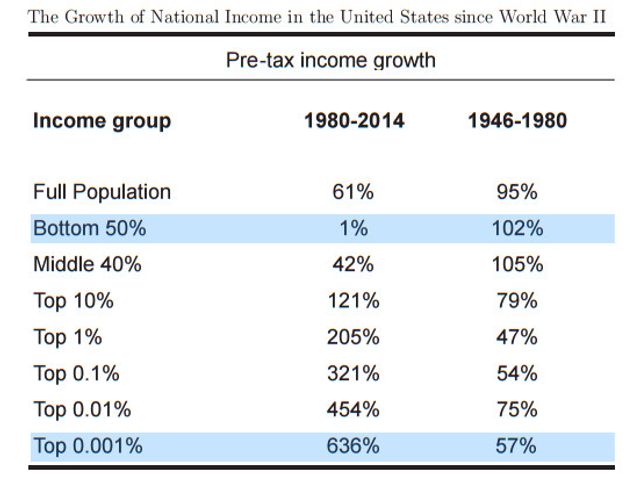 අධ්‍යයනය 1946 සිට 1980 දක්වාත් 1980 සිට වර්තමානය දක්වාත් කාලපරිච්ඡේද දෙක අතර තියුනු වෙනස් වීමක් ලේඛනගත කරයි. පලමු කාලපරිච්ඡේදය තුල, පතුලේ සිටින සියයට 50 ගේ බදු ගෙවීමට පෙර ආදායම සියයට 102 කින් ඉහල නගිමින් දෙගුනයකට වඩා වැඩි වූයේ, මුදුනේ සියයට 1 හි ආදායම සියයට 47 කින් පමනක් ඉහල නගින අතර ය. ඒ අවධිය තුල මුදුනේ සියයට 0.001 ආදායම සියයට 57 කින් ඉහල ගියේ ය.