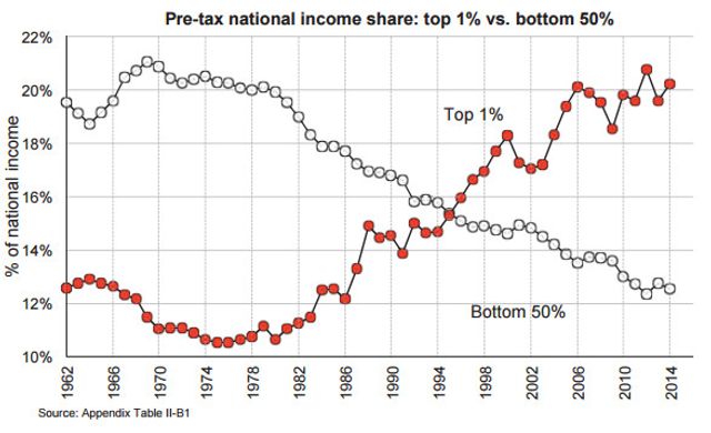 කෙසේ වුව ද 1980 පටන්, පතුලේ සියයට 50ගේ ආදායම වසරකට (වර්තමාන වටිනාකමට අනුව) ඩොලර් 16,000 පමන මට්ටමේ එක තැන පල් වෙමින් පැවතියේ, මුදුනේ සියයට 1 සියයට 205කින් ද මුදුනේ සියයට 0.001 සියයට 636 කින් ද වර්ධනය වන අතරතුර ය.