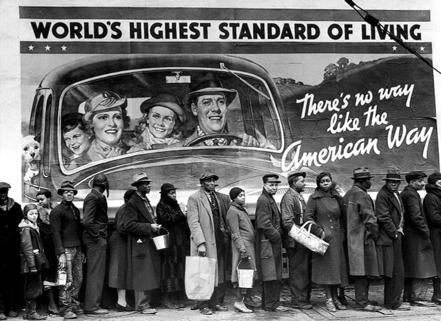 (1937© Margaret Bourke-White/Timepix) මහා අවපාතය අවධියේ දුගීන්ගේ ආහාර පෝලිමකට ඉහලින් දැක්වෙන, ජාතික නිෂ්පාදකයින්ගේ සංඟමයෙහි (නෑම්) පෝස්ටරයක්.