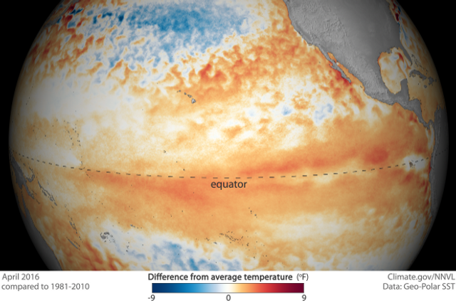 නාසා ආයතනය රැස්කල දත්ත වලට අනුව, 2016 මුල් මාස සදහා නව උෂ්නත්ව වාර්තා සකස් කර ඇත. එක් පරියේෂකයෙකු “අසාමාන්‍ය” උෂ්නත්වය ලෙස සඳහන් කල දේ පිටුපස ඇති ගාමකය, අසාමාන්‍ය පරිදි දිගු කාලයක් පවතින එල් නිනෝ සංසිද්ධියයි. ඒ අතරම පසුගිය වසර කිහිපයේ කරන ලද පරියේෂන පෙන්නුම්කර ඇත්තේ, එල් නිනෝ හා එහි සිසිල්-ජල සහචරයා වන ලා නිනා සංසිද්ධිය, අහිතකර මානව කටයුතු නිසා උග්‍ර කල දේශගුනික විපර්යාස මගින් වඩාත් ආන්තික තත්වයට පත්කර ඇති ආකාරයයි.