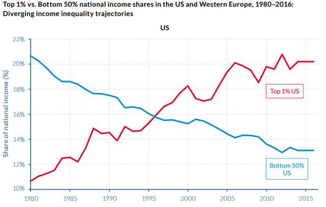 1980 දී සියයට 10ක් වූ එජ ආදායම් උපයන්නන්ගෙන් ඉහලම සියයට එකෙහි ආදායම් පංගුව, 2016 වන විට 20ක් දක්වා වර්ධනය වී ඇති බව පරීක්ෂකයෝ වාර්තා කලහ. ඒ, පහල සිටින සියයට 50 ආදායම් පංගුව එම කාල පරිච්ඡේදය තුලදීම සියයට 20 සිට 13 දක්වා පහල වැටෙත්දී ය. දශක තුනකට පෙර ධනයෙන් සියයට 40ක් පාලනය කල පතුලේ සිටින සියයට 90 දැන් පාලනය කරන්නේ සියයට 27ක් පමනි.