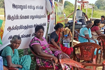 මුලතිව් දිස්ති‍්‍රක්කයේ කේපාපුලවූ ප‍්‍රදේශයේ පිලක්කුඩිඉරිප්පු ගම්මානයේ ජනතාව පසුගිය ජනවාරි 31 සිට හමුදා කඳවුරු ඉදිරියේ ඉදිකරගත් කුඩාරම් තුල රෑ දවල්, අව් වැසි නොතකා සිය දරුවන් සමග වාඩිලාගෙන එකදිගට උද්ඝෝෂනයේ යෙදී සිටින අතර පුදුකුඩියිරිප්පු ප‍්‍රදේශයේ ඉඩම් අහිමි කෙරුනු ජනයා පෙබරවාරි 2 සිට උපවාසයක නිරතවෙමින් මෙවැනිම උද්ඝෝෂනයක යෙදී සිටිති.