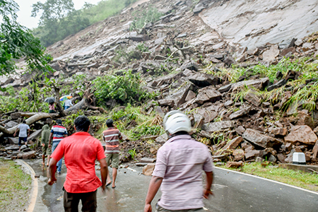 නායයාමට ලක්වූ ගම අසල ගල්තලාව කැඩී මහා මාර්ගය අවහිර කරමින් වැටී ඇති සැටි.