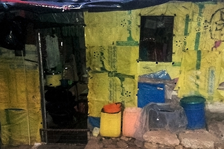 ගෝනිවලින් වටකොට ඇති තවකාලික නිවාස