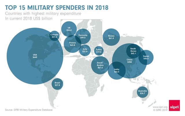ස්ටොක්හෝම් ජාත්‍යන්තර සාම පර්යේෂන ආයතනය (සිප්රි) මේ සතියේ ප්‍රසිද්ධ කල වාර්ෂික වාර්තාවකට අනුව, 2018 දී ඩොලර් ටි්‍රලියන 1.8ක ඉහලකට නැගෙමින් ගෝලීය මිලිටරි වියදම පශ්චාත්-සීතල යුද්ධ නව ඉහලකට ලඟා වී ඇත. මෙය පෙර වාර්තාගත වාර්ෂික අගය වූ 2017 ලෝක පරිමාන මිලිටරි වියදම්වලට වඩා සියයට 2.6ක වැඩිවීමක් සලකුනු කරයි.