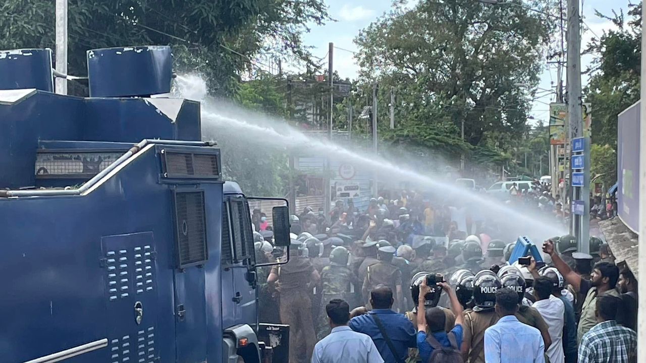 15 ஜனவரி 2023 அன்று யாழ்ப்பாணத்தில் அரசடி சந்தியில் போராட்டம் நடத்திய 'காணாமல் போனவர்களின்' உறவினர்கள் மீது பொலிசார் நீர்த்தாரை பிரயோகிக்கின்றனர் [Photo by Tamilnews1-Mayurapriyan]